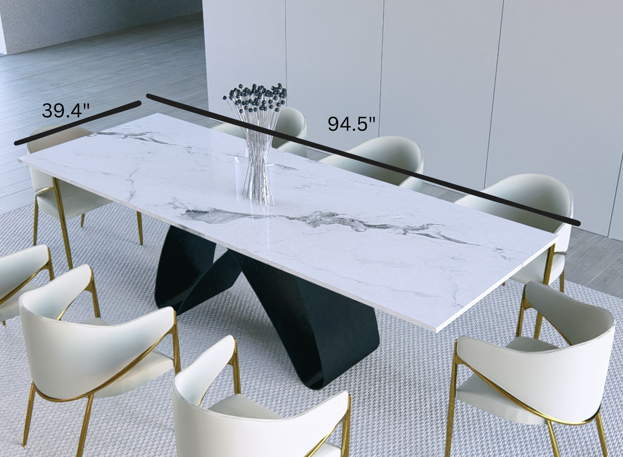 Bianca 95″ Extendable Dining Table boasts a sophisticated marbled sintered stone surface that mimics the look of premium marble, offering an ultra-durable, scratch-resistant, and heat-resistant finish—perfect for everyday use and special occasions alike. Resistant to scratches, stains, and heat, this high-performance material is built to withstand everyday use while maintaining its pristine appearance.