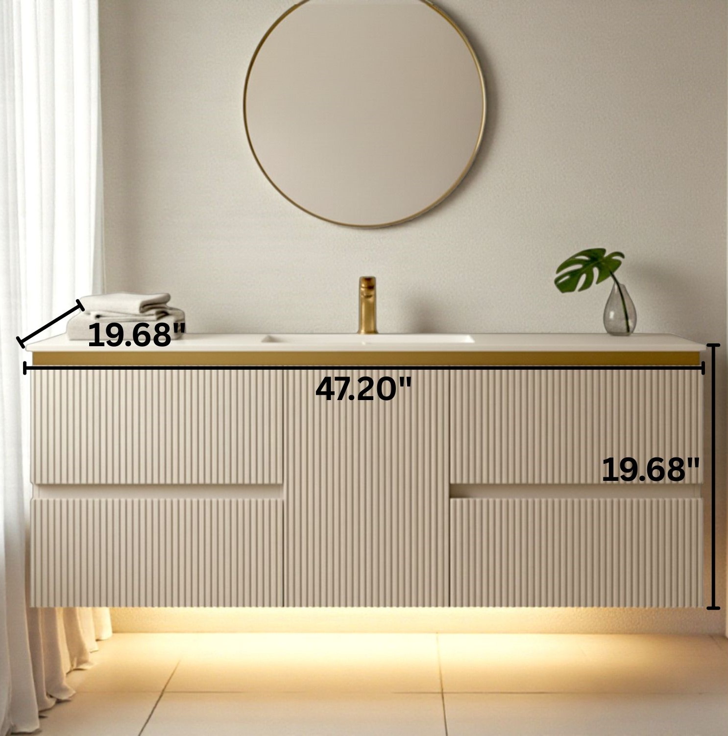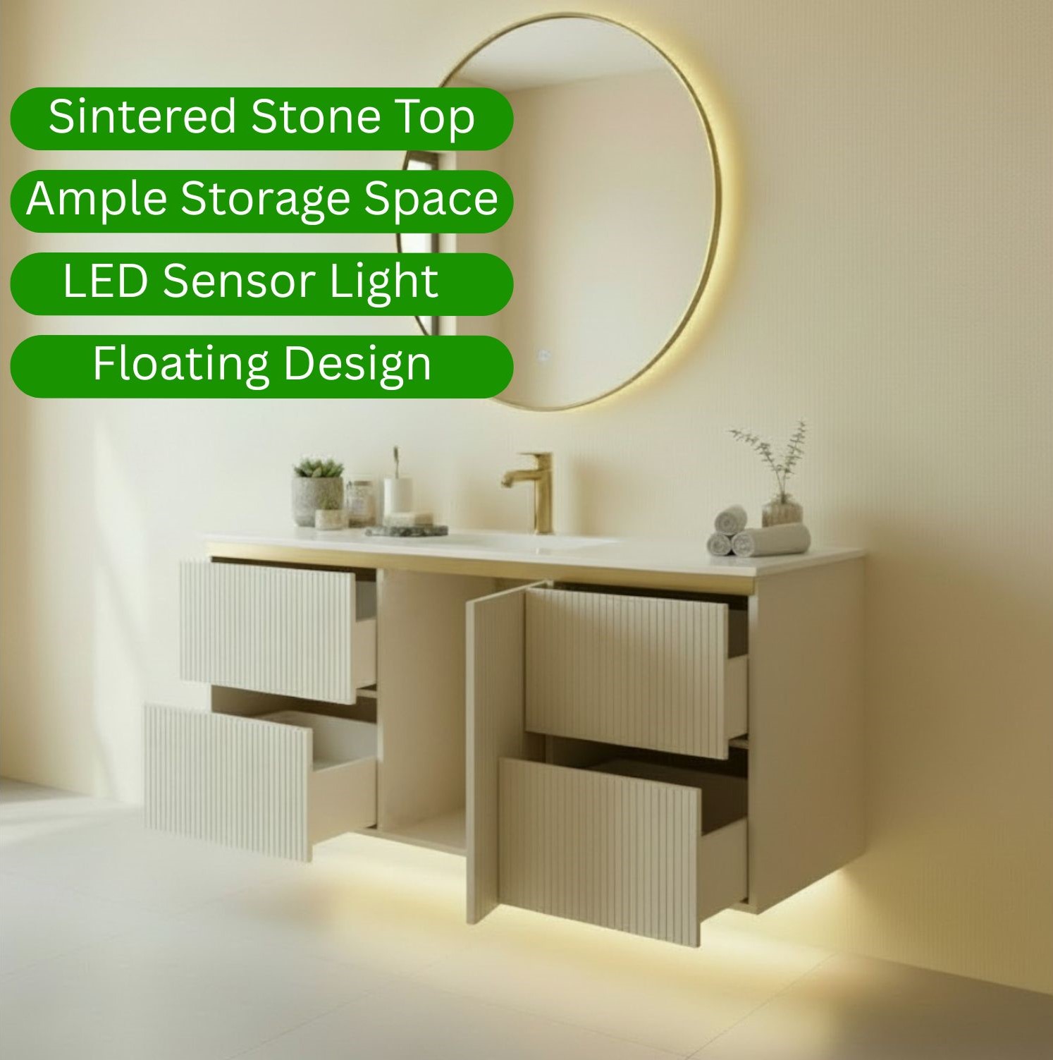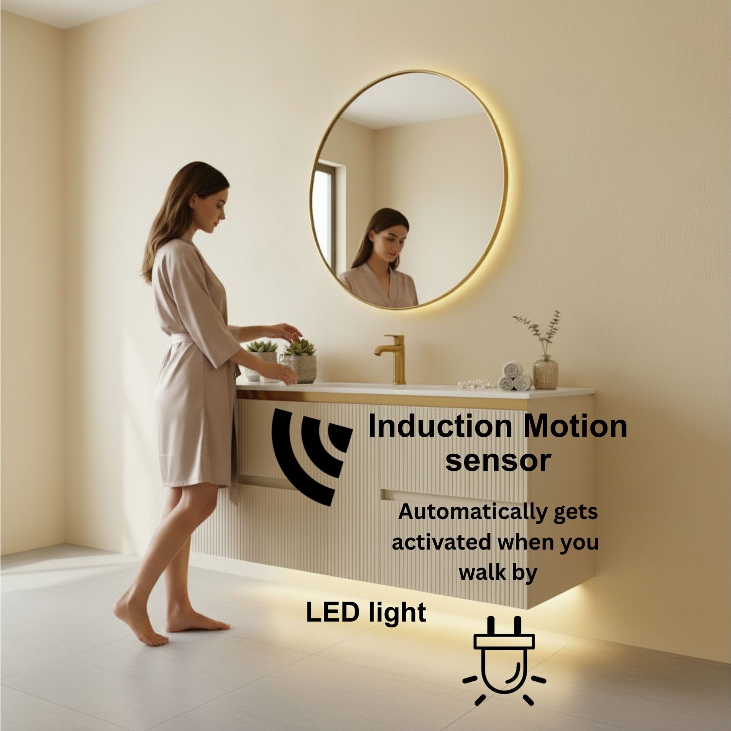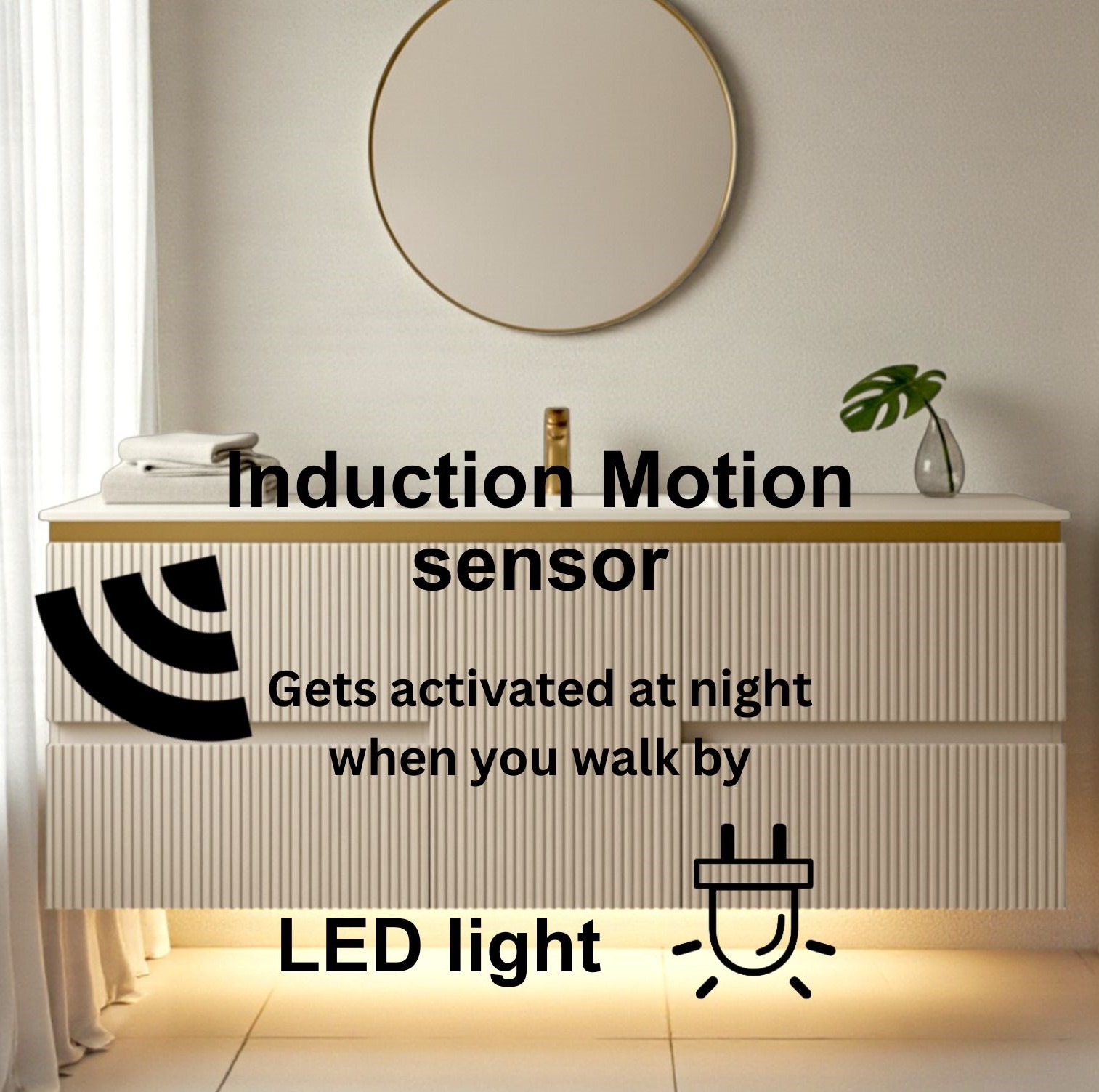 - LED LIGHTING + INDUCTION MOTION SENSOR: built-in LED lighting strip (120V) beneath the vanity that activates automatically with motion – The light will only come on (15-30 seconds) when motion is detected at night, not during the day, due to its intelligent light-sensing technology. perfect for night use and energy efficiency.