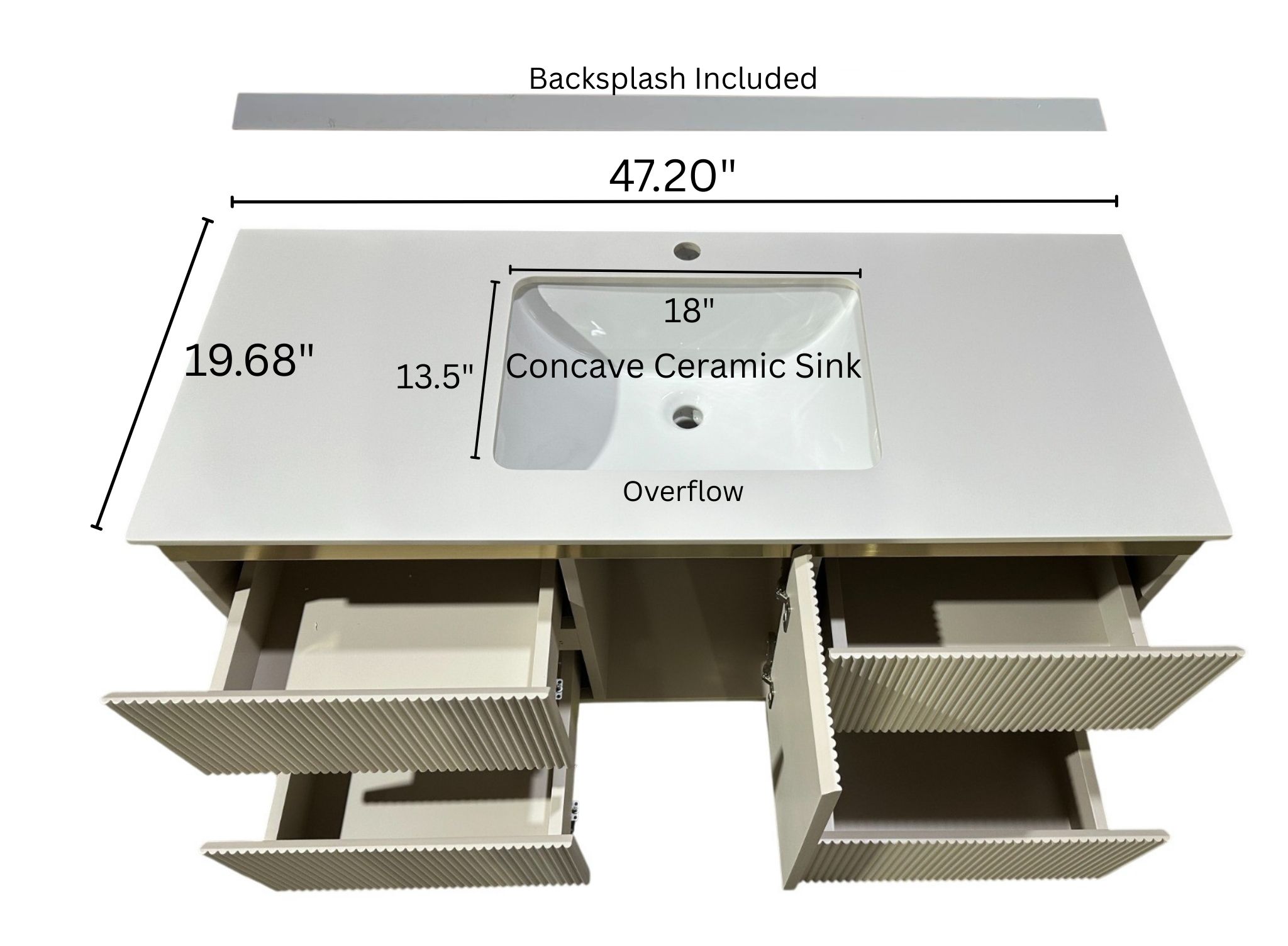 - INCLUDED: Backsplash | LED motion sensor light | Overflow | Mounting Bracket | 1 Undermount Rectangular Ceramic Sink | Solid Wood | Soft Closing Cabinet Doors | Single-Hole | Stainless Steel Hardware | Cabinet Pre-Assembled | 1 Year Manufacturer Warranty